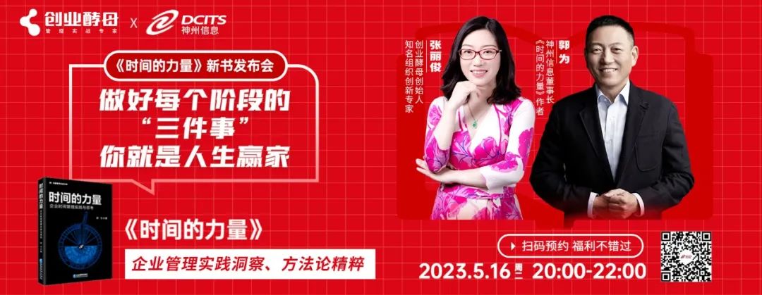 5月16日20:00,郭为将携新书《时间的力量》做客创业酵母创始人、知名组织创新专家张丽俊的直播间,共同探讨时间管理,为读者揭开生产力、效率、利益与时间之间的奥秘。