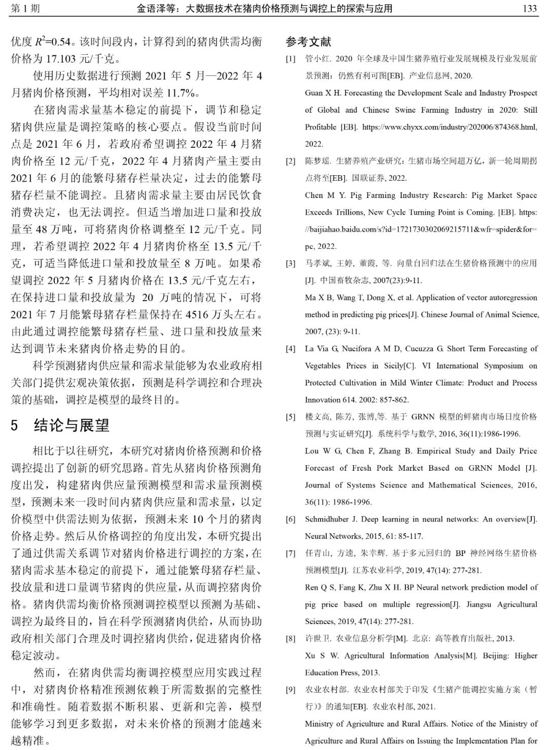 该研究论文提供了通过调整影响猪肉供应量的核心因素来调节未来猪肉价格走势的思路和方法,旨在科学预测猪肉供需量及未来价格走势,协助政府相关部门合理及时调控猪肉供给,促进各时刻的猪肉供需均衡,猪肉价格稳定在供需均衡的合理区间。