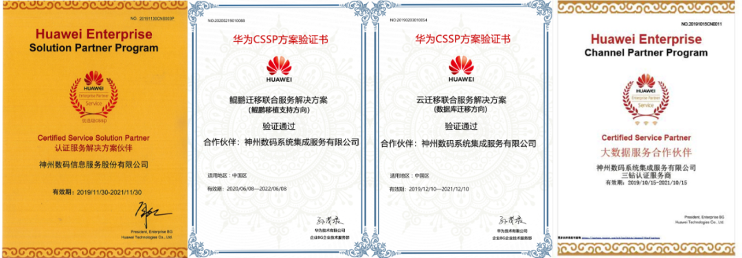 神州信息在为华为云提供云建设、云运维、云运营和云安全服务后,再次成为了华为云迁移(包括数据库迁移)和鲲鹏软件移植的CSSP认证服务商,以及华为大数据的CSP认证服务商,再次印证了神州信息具备华为云体系化服务能力,即完整的云咨询、云建设、云迁移及云运维服务能力,同时一系列认证的获得为神州信息持续扩展金融科技业务提供了强有力支撑。