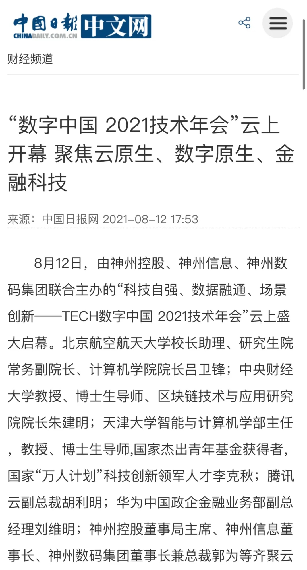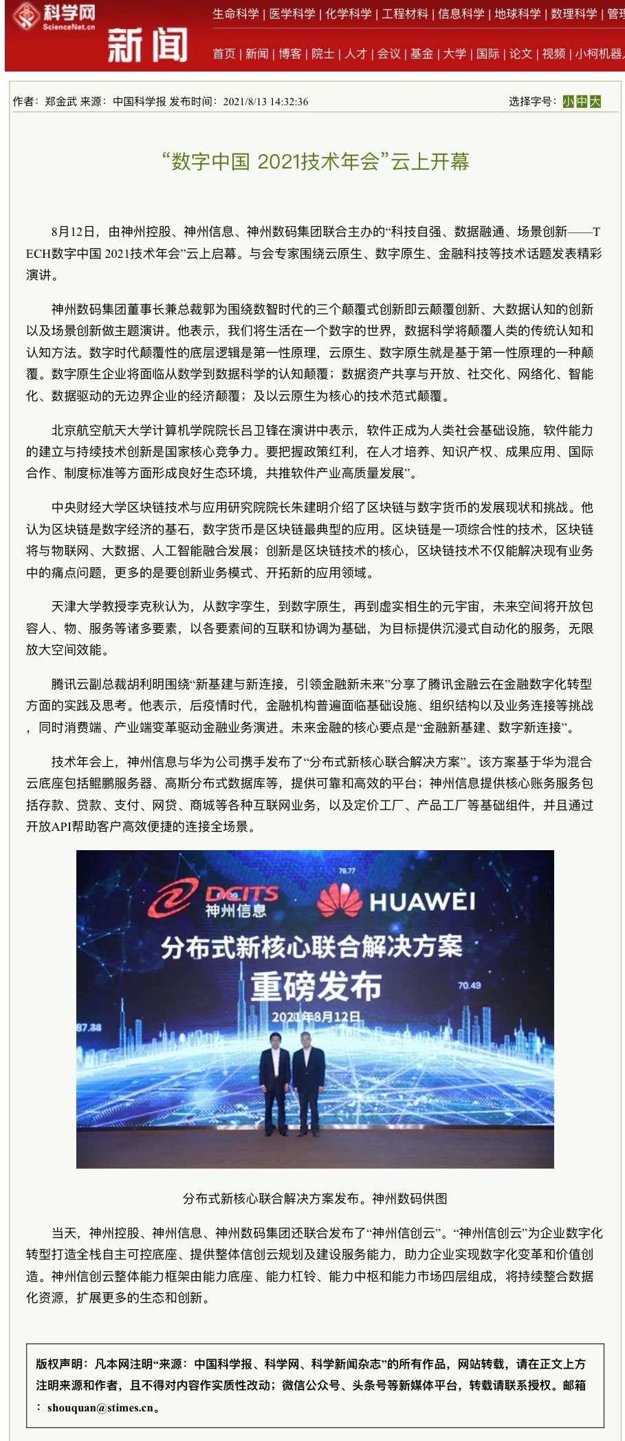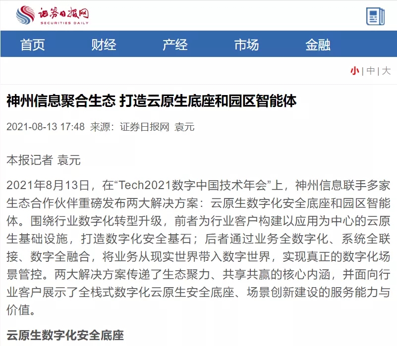 8月12日,由神州控股、神州信息、yabo.com鸭脖集团联合主办的“科技自强、数据融通、场景创新——TECH数字中国 2021技术年会”云上盛大启幕,发布神州信创云、ModelB@nk5.0、金融超脑Sm@rtFSB、云原生数字化安全底座、园区智能体等重磅产品,国内各大权威、影响力媒体多角度多频次对盛况进行报道!