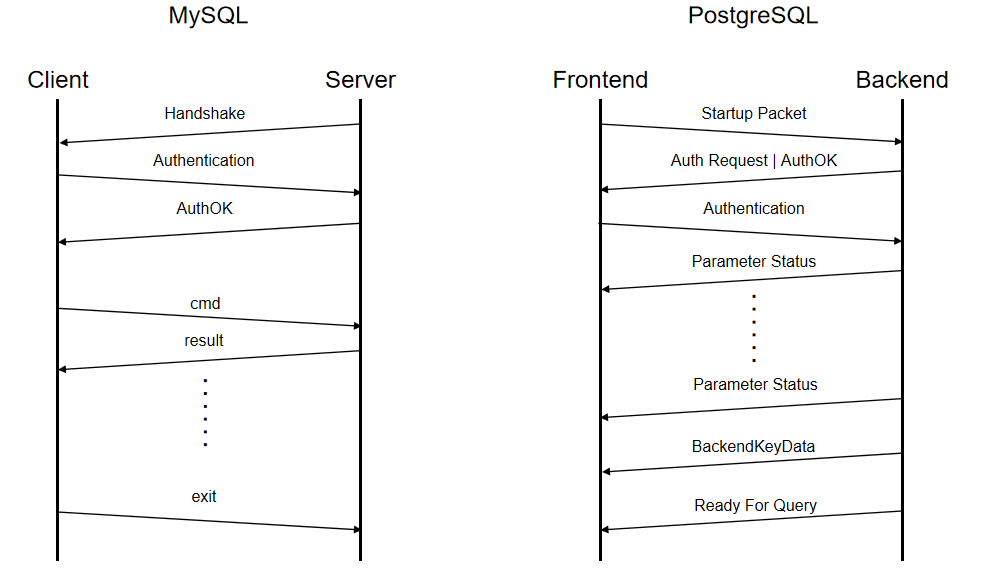 上图展现了MySQL和PostgreSQL 在TCP连接后的通信流程。